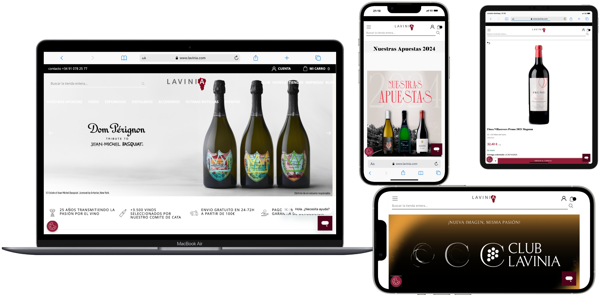No solo se trataba de desarrollar un sitio web referencia en el sector del vino. Lavinia nos solicitó adaptarnos al equipo de diseño con el que cuentan en Francia para, según nuestra metodología One Team, integrarnos con ellos y llevar a cabo un espacio donde los amantes del vino pudieran llevar a cabo sus compras de una forma fácil y accesible.